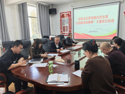 为深入学习贯彻习近平总书记关于教育的重要论述,落实全国教育大会精神,结合巡视整改工作任务要求,2025年10月27日下午,国资及实管处联合党支部在行政D楼二楼会议室开展“弘扬教育家精神”主题党日活动,党支部书记杨德嵩同志主持,国有资产管理中心、实验室管理处全体人员参加。